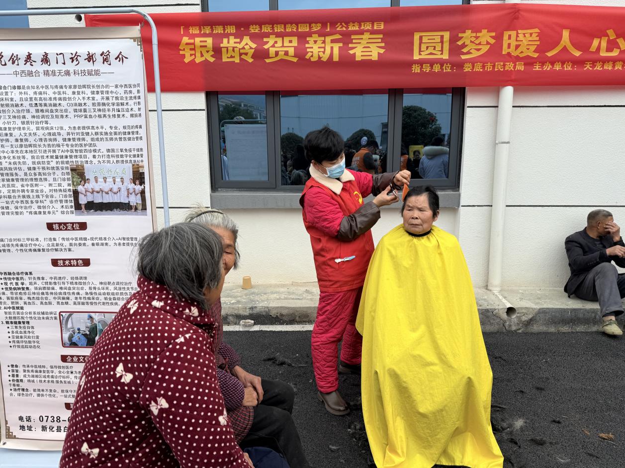 活动现场专门设置了义剪、义诊、春联书写赠送、老年新春互动等公益区域,社工和志愿者为老人提供免费理发、健康咨询等服务,书写并赠送寓意吉祥的春联,将新春祝福送到老人手中。活动还融入了“银龄圆梦”暖心互动环节,倾听老年人心声,精准回应他们在生活和文化方面的需求。